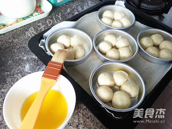 蘸料的20克黃油和20克細(xì)砂糖隔熱水融化并冷卻至濃稠,厚厚的涂一層在生胚上,進(jìn)行二次發(fā)酵
